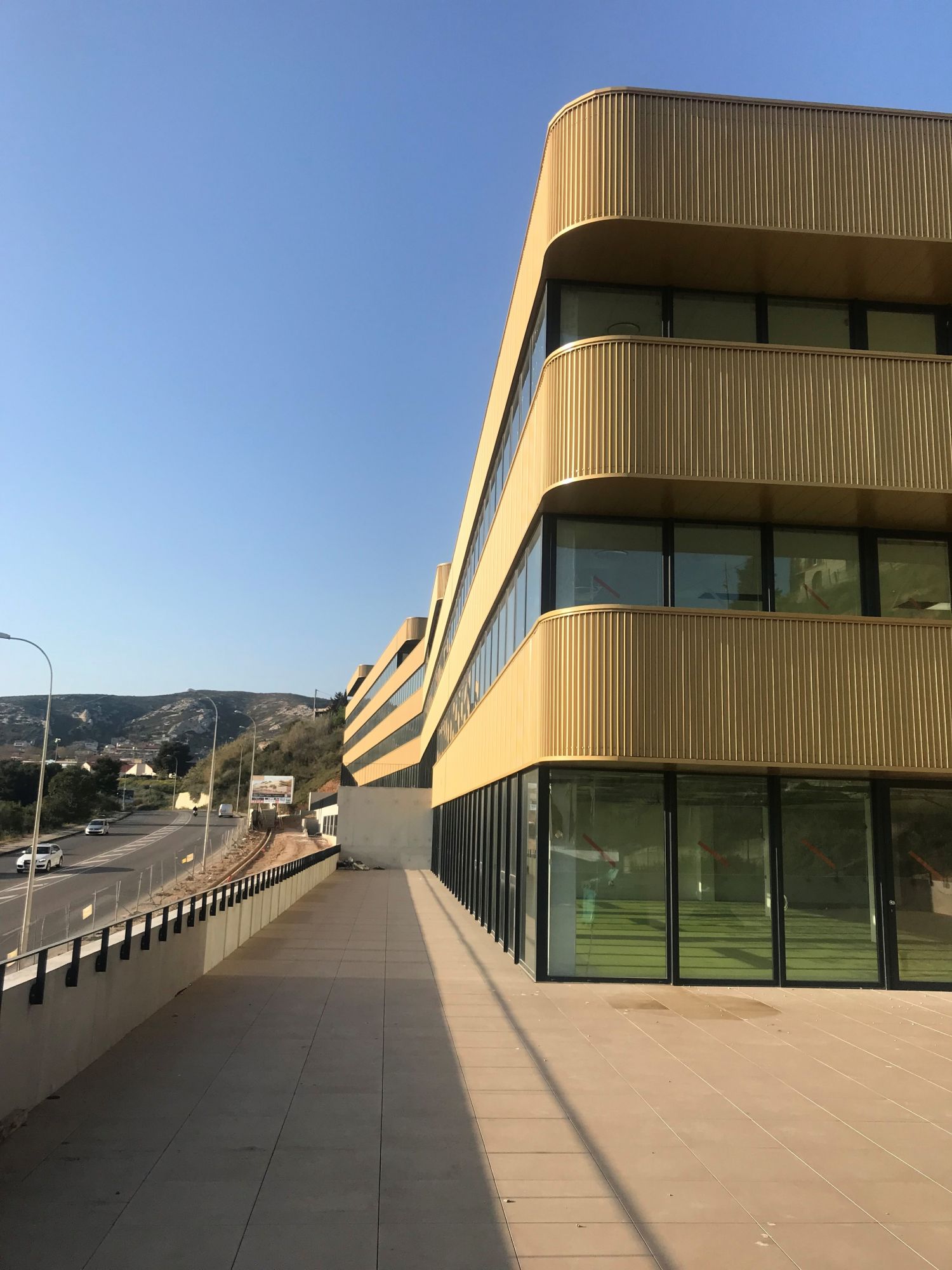 Le défi architectural a été de concevoir un ouvrage qui restructure harmonieusement sans transformer radicalement la frange urbaine dans laquelle il est situé, une bande de talus végétalisé en bordure de la voie, entre des petits habitats pavillonnaires à l’Est et l’échelle des grands entrepôts du port de pêche de Saumaty à l’Ouest. L’ouvrage devait donc participer à requalifier cet espace en tenant son rôle de transition. Par ailleurs, il était important que le projet apporte une réponse architecturale adaptée à une spécificité paysagère unique : le site est en effet adossé à la falaise de Mourepiane, s’ouvrant vers la baie de Marseille et offrant un panorama d’exception sur la ville côtière.