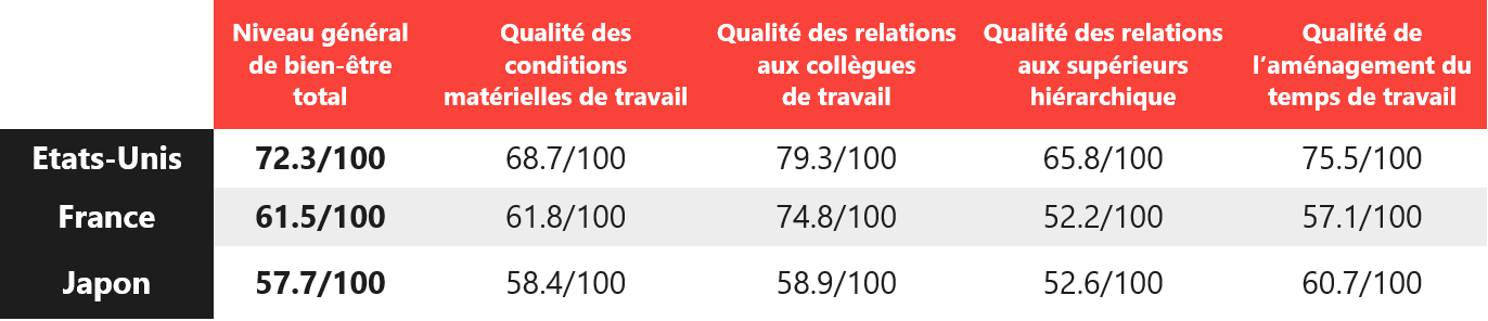 En bon Poulidor, les salariés français arrivent en seconde position distancés en moyenne de 10 points par un Armstrong intouchable. Les Japonais ferment la marche avec un score moyen légèrement supérieur à la barre symbolique des 50 points. Aussi étonnant que cela puisse paraître, le bien-être au travail des français est apparemment plus proche de celui de leurs homologues d’Extrême-Orient que de celui des Américains, malgré les différences culturelles.