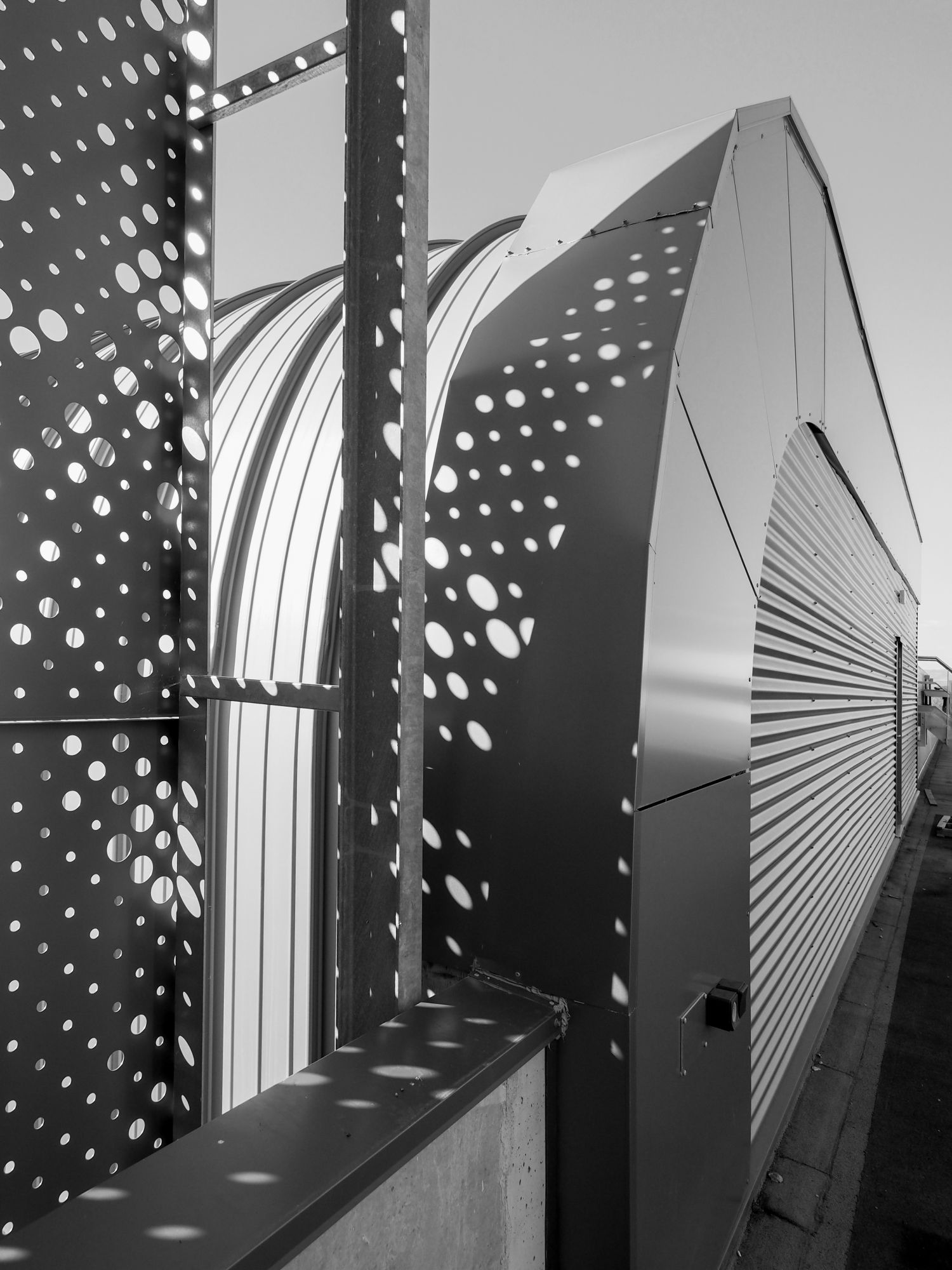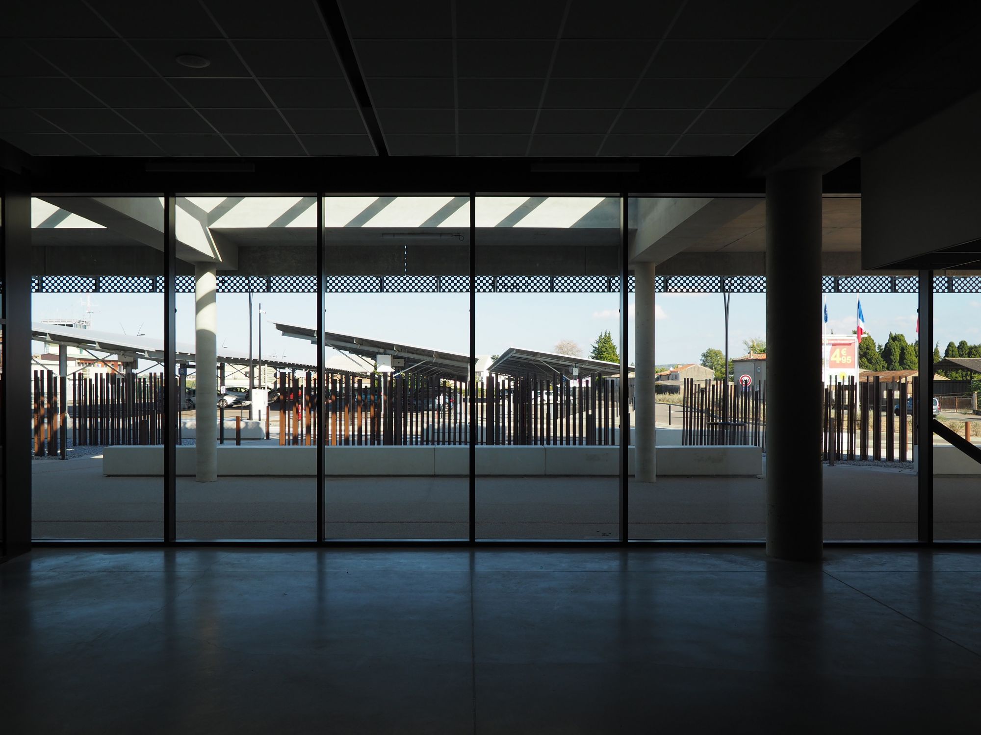 La galerie de liaisons, très largement vitrée, est conçue comme une passerelle/pont pour enjamber l’aire de manœuvre et permet de préserver de futurs travaux de l’extension.