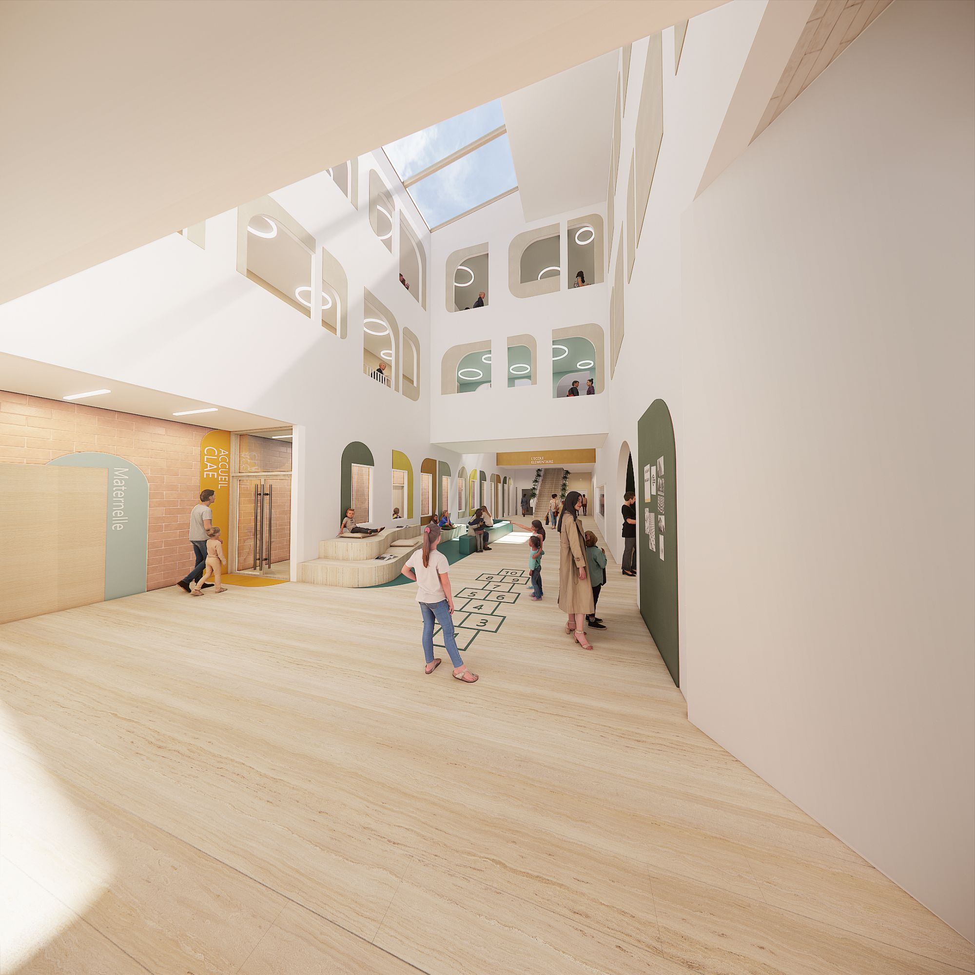 À l’arrière de la parcelle, les espaces en rez-de-chaussée, dédiés aux jeunes élèves et aux réfectoires, s’étendent harmonieusement dans la topographie du terrain, avec des cours de récréation agencées autour de ces espaces. Enfin, la toiture, pensée comme une cinquième façade, alterne verrières et panneaux photovoltaïques pour une optimisation énergétique, tout en limitant la visibilité des réseaux pour préserver l'esthétique.